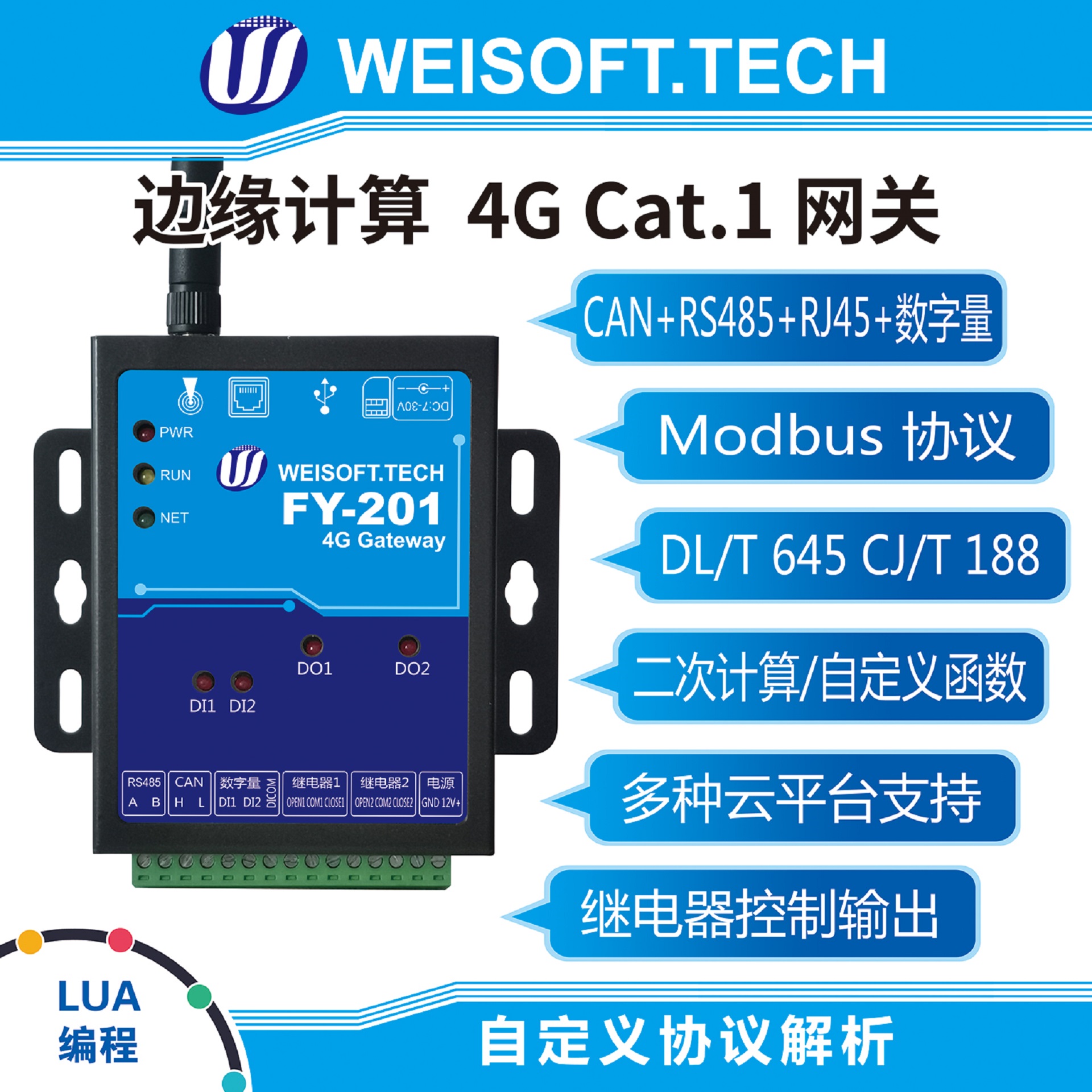 提供1路RS-485串口通信接口,1路CAN输入,2路数字量输入,和2路继电器输出,增加有线网络RJ45接口支持,CAN总线支持。